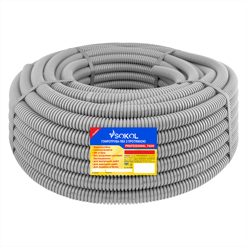 Гофрированная ПВХ труба Sokol Professional представляет собой пластиковые трубчатые каналы для установки в них электрических кабелей, для защиты от пыли, влаги. Труба может выдержать напряжение тока до 1000 Вт.